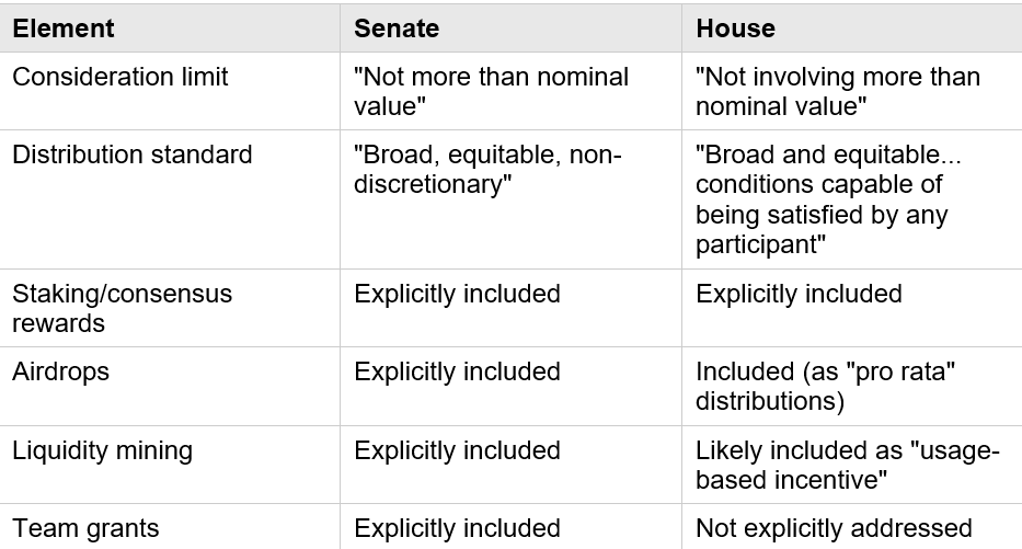 - No explicit team carveout: Unlike the Senate, the House definition does not explicitly include distributions to founders/employees/service providers. This creates ambiguity about whether team token grants qualify as end user distributions or require separate analysis.