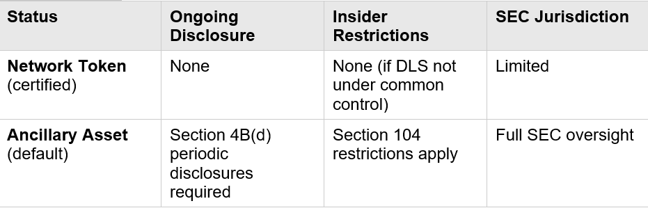● Section 4B(b)(4) “Prior Certification”: Determines whether your token is a “network token” (full non-security status) or “ancillary asset” (ongoing disclosure obligations). Without pre-issuance certification, all tokens are presumed to be ancillary assets.