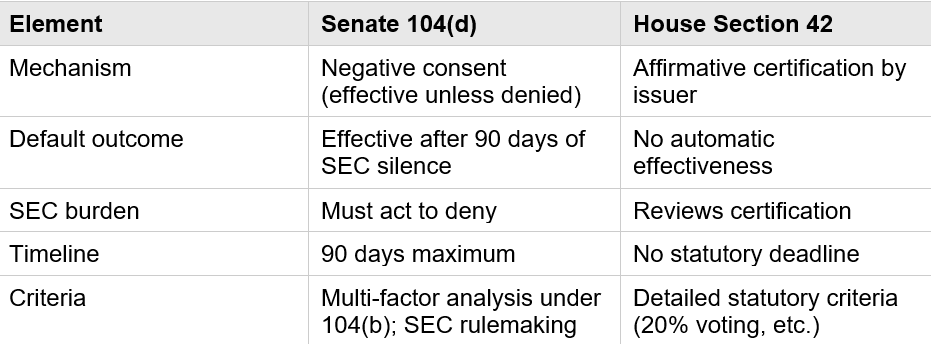 5. Both frameworks require a path to decentralization, but with different mechanics. The Senate’s 104(d) certification (90-day negative consent) is more favorable than the House’s Section 42 process (no statutory deadline).