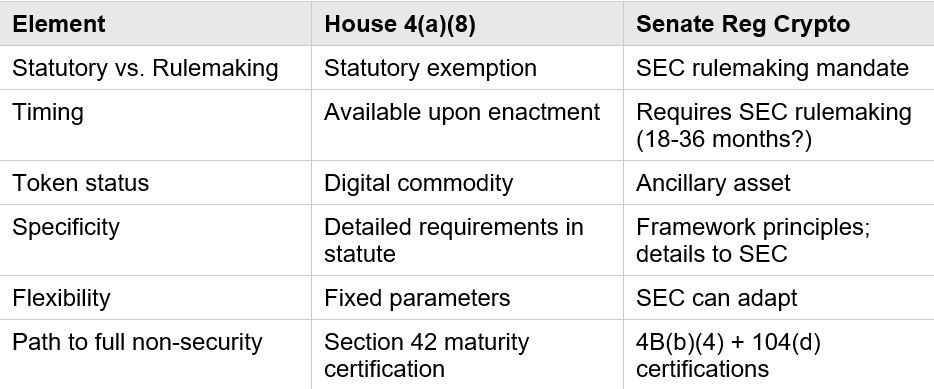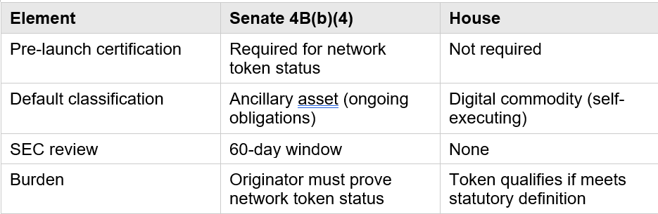 Key Insight: Under the House framework, token classification is self-executing—if the token meets the definition, it’s a digital commodity. Under the Senate framework, all tokens are presumed to be ancillary assets until certified, creating regulatory overhang even for exempt distributions.