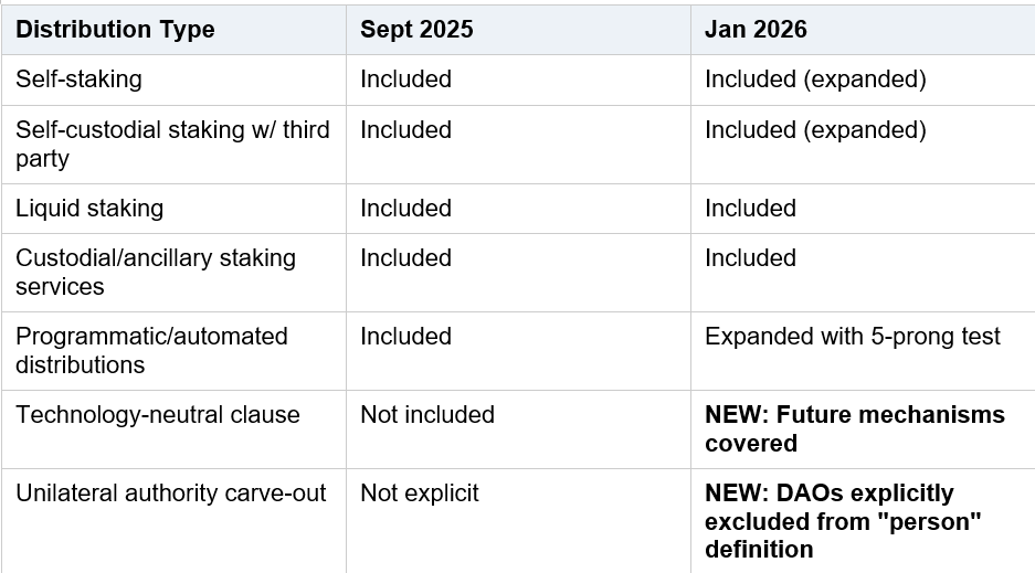 Both versions exempt “gratuitous distributions” from securities treatment. The January 2026 version substantially expands enumerated safe harbors: