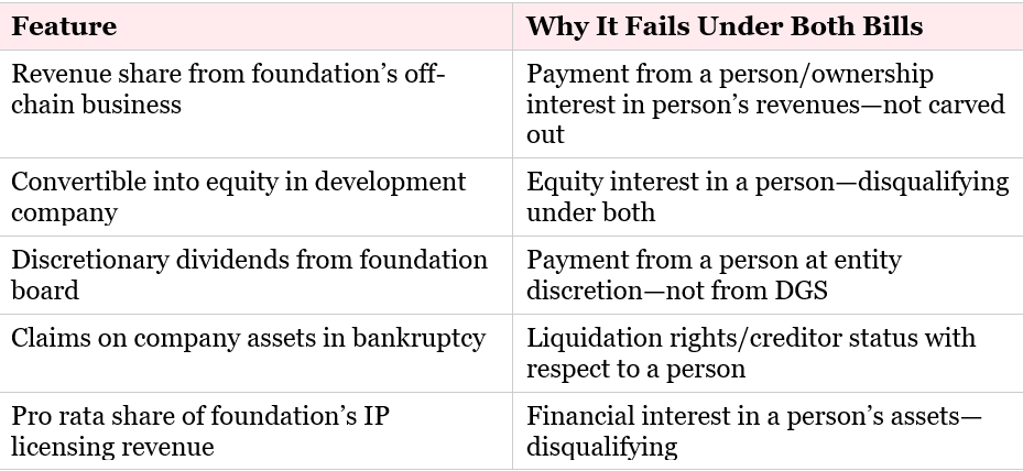 Both Frameworks: Distributions from a “decentralized governance system” are explicitly carved out of disqualifying rights in both bills. Both define DGS identically: transparent, rules-based, not under effective control of any person.