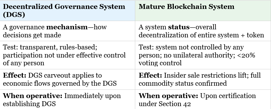 The critical ambiguity practitioners should flag: what level of coordinated ownership or control defeats DGS status? The Senate delegates this to SEC rulemaking with a multi-factor framework. The House provides a 20% voting threshold for maturity certification, but whether that threshold informs the DGS analysis is textually unclear. Conservative advice is to structure for both readings: aim for sub-20% coordinated control, open-source code, no unilateral authority, and functional programmatic mechanisms.